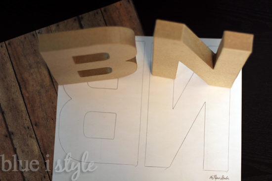 The Restoration Hardware letters are made of solid wood, so to achieve a similar look with my paper mache letters, I picked up a couple of sheets of barnwood scrapbook paper (you'll need one sheet of paper for every two letters). I began by using a pencil to reverse trace each letter onto the back of the scrapbook paper, keeping in mind that I wanted the wood grain to run vertically.